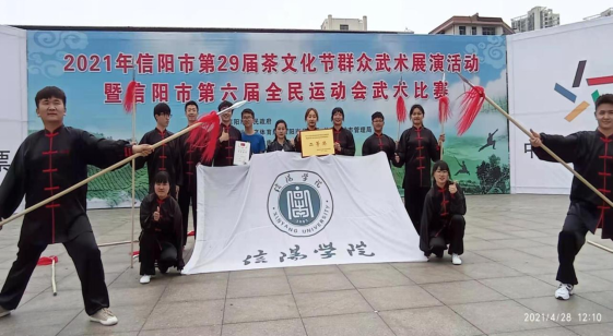 举办比赛历史成绩:2021年4月3日受邀参加信阳市董家河镇非物质文化遗产汪家拳的揭幕式并进行表演。2021年4月27日至28日,我校汪家拳社团部分成员代表学校参加“信阳市第六届全民运动会——武术”比赛,教练员由老太阳集团8722雷丹云担任。经过两天激烈角逐,我校代表队斩获“集体项目二等奖”。在单项比赛中:李炳坤、刘文婧两位同学分别斩获传统类汪家拳男子、女子青年组一等奖;刘柯江、朱闪闪两位同学分别斩获传统类汪家拳男子、女子青年组二等奖;刘文婧、李瑶、刘柯江、刘亚宁同学荣获传统类传统枪二等奖。2022年4月30日,与其他社团联合举办传统类联欢晚会。