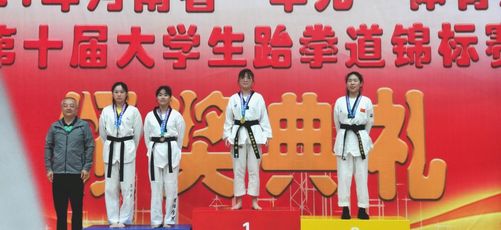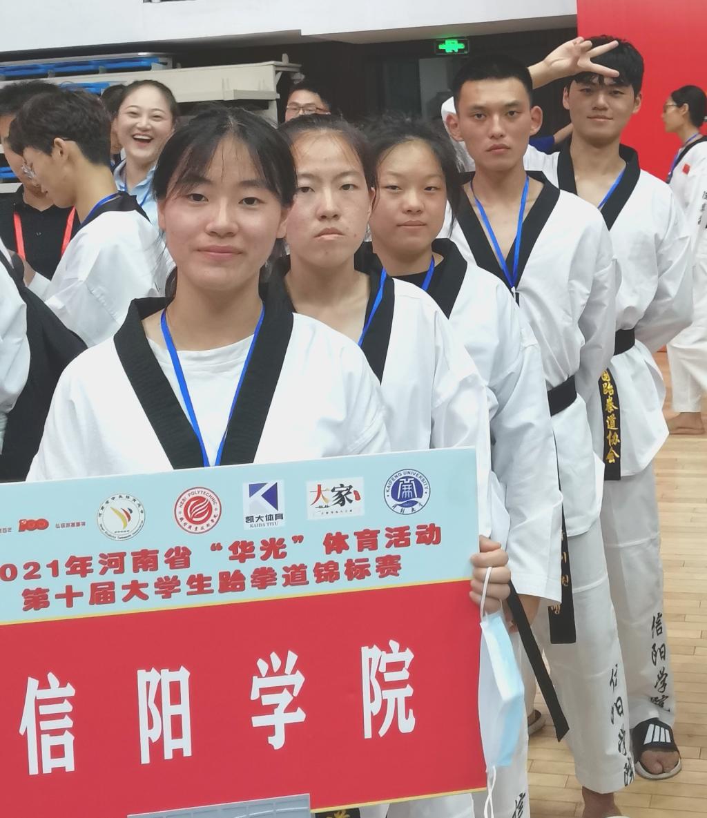 7月20日,河南省教育厅、河南省学生体育总会跆拳道协会主办的河南省“华光”体育活动第十届大学生跆拳道锦标赛,在鹤壁职业技术学院千鹤之舞体育馆闭幕。我校跆拳道队首次参加此项赛事,经过5位学生的顽强拼搏,最终我校跆拳道共获得1金1银3铜的佳绩,其中,金亚宣勇夺本科甲组女子远度击破第一名、个人竞技53kg第三名、个人品势第三名,王一勇夺本科甲组女子高度击破第二名,王一、金亚宣、刘赛亚勇夺女子团体竞技第三名的成绩,周翔宇和杜博远分别获得男子个人品势第四名和第五名的成绩。