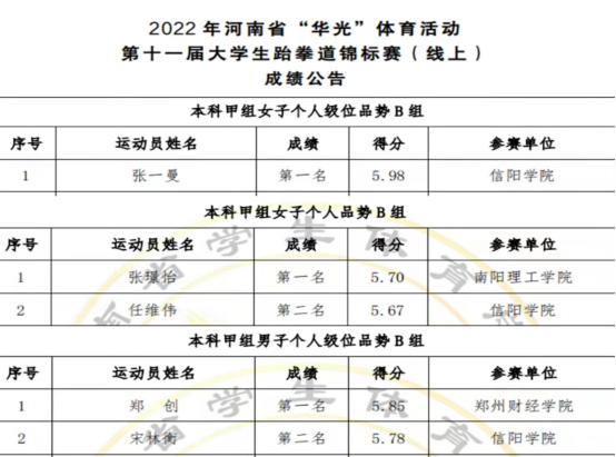 在2022年6月29日,由河南省教育厅主办的2022年河南省“华光”体育活动第十一届大学生跆拳道锦标赛(线上)顺利结束。太阳集团tcy8722跆拳道运动队共获得1金2银1铜的佳绩。