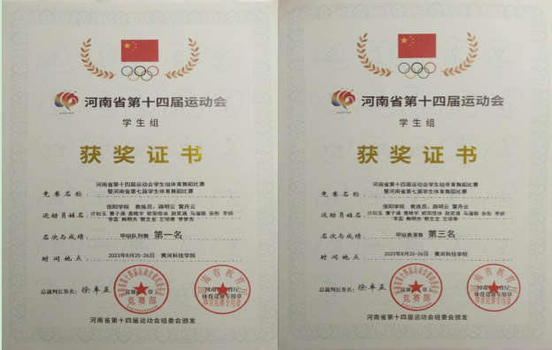 8月26日上午,本届运动会暨南省第七届学生体育舞蹈比赛在黄河科技学院举行,有来自全省高校近1000名运动员参加比赛。经过激烈角逐,我校D.M体育舞蹈队荣获团体舞甲组队列舞第一名和甲组表演舞第三名的成绩。并获得甲组单项奖:3项冠军、2项亚军和2项季军等共计18项。
