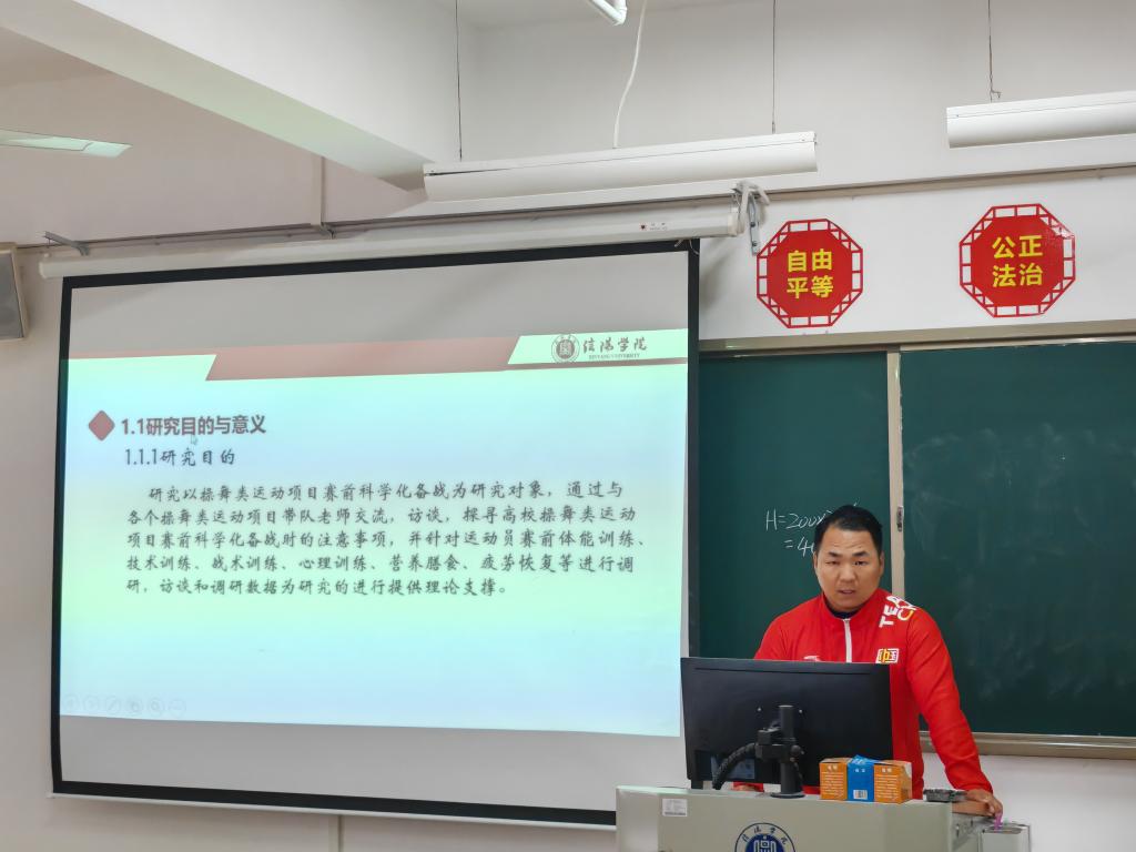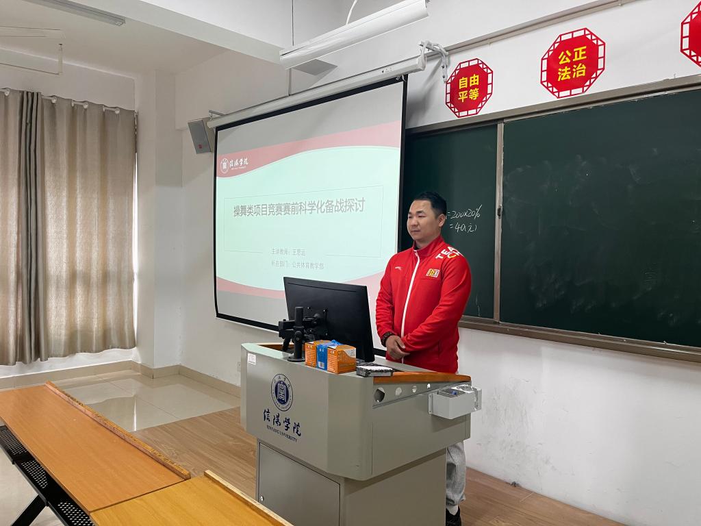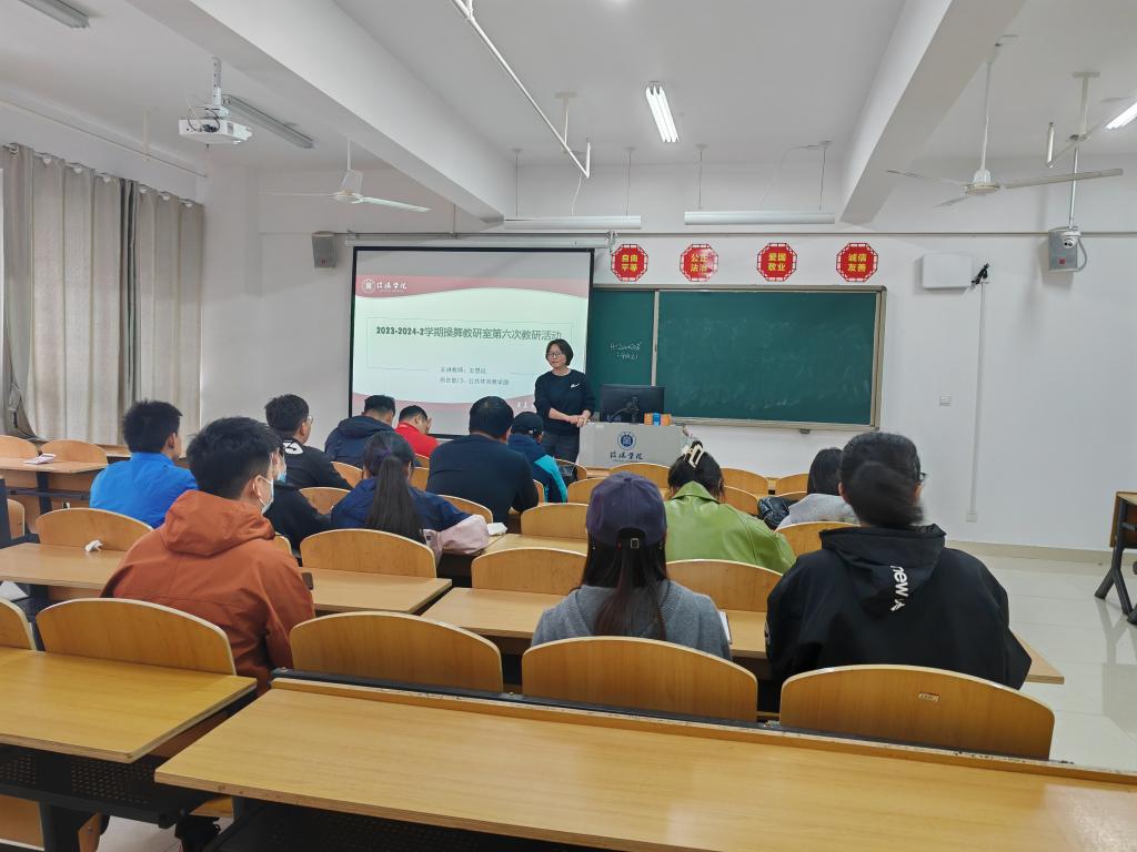 4月30日下午,操舞教研室依据教研活动时间安排,举行了以“高校操舞类运动项目竞赛赛前科学化备战探讨”为主题的教研活动,活动在综合楼606教室举行,活动采用“文化沙龙”形式进行汇报和探讨。操舞教研室全体教师参加,活动由操舞教研室主任剧红梅主持,王思远老师主讲。