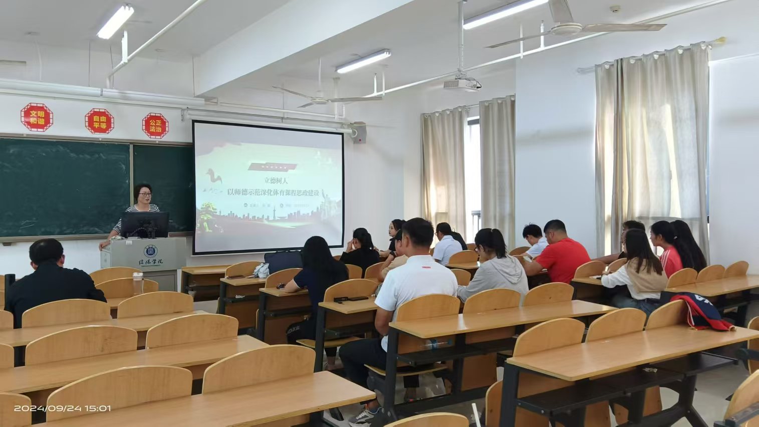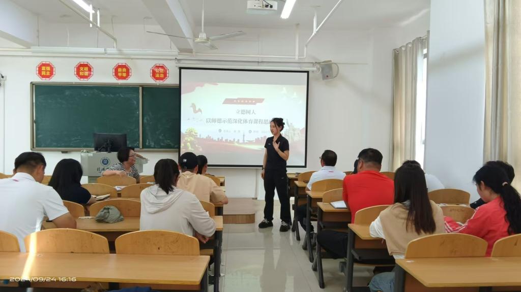 活动分两部分,首先张婧老师针对“立德树人视域下师德示范深化体育课程思政建设”教研主题,从师德师风理论基础、体育课程思政建设探索等几方面展开阐述。