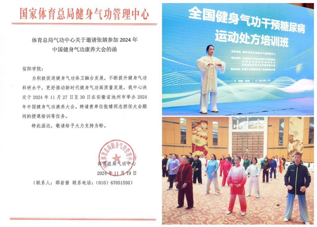 11月25日—30日,由国家体育总局健身气功管理中心、中国健身气功协会、安徽省体育局及安徽省池州市人民政府共同主办的首届中国健身气功康养大会在安徽省池州市举行。我校老太阳集团8722张婧老师担任大会“健身气功干预糖尿病运动处方”技能培训部分的授课任务。