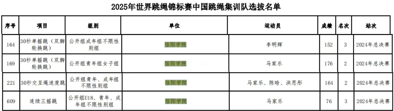 我校在2024年全国跳绳联赛总决赛中取得了3个第二、2个第三、1个第四、1个第五的好成绩。其中李明辉老师以及马家乐、陈晗、洪思彤三位同学都取得了2025年世界跳绳锦标赛的入场券。