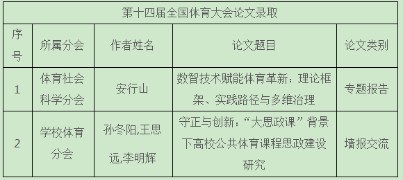 全国体育科学大会是由中国体育科学学会主办的国内最具权威性和影响力、最大规模和最高层次的综合性体育学术会议,是全国体育科技工作者展示最新体育科研成果、科技成果和交流科技信息的盛会。近日,中国体育科学学会公布了第十四届全国体育科学大会论文录取结果。